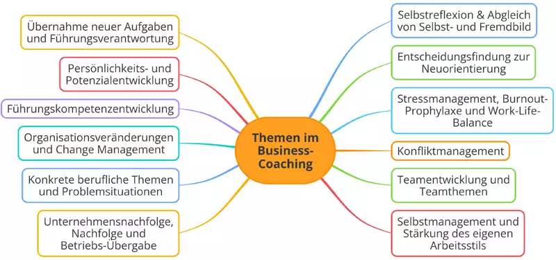 Viele unserer Klientinnen und Klienten nutzen Coaching, um ein besseres Verständnis ihrer eigenen Person zu gewinnen. Ein Coaching "Boxenstopp & Neuorientierung" liefert die Basis für eine berufliche Neuorientierung und hilft dabei, Zufriedenheit zu finden. Im Karriere-Coaching geht es darum, die eigene Karriere und berufliche Weiterentwicklung in den Fokus zu nehmen. Im Führungskräfte-Coaching geht es um die Verbesserung eigener Führungsfähigkeiten und um das Kennenlernen von Führungsinstrumenten. Die Bewältigung von Stress oder Burnout sowie die Verbesserung der eigenen Gesundheit und des Wohlbefindens stehen im Gesundheitscoaching im Fokus. Im Konflikt-Coaching steht die lösungsorientierte Konfliktklärung zwischen Personen, in Gruppen oder in Teams im Mittelpunkt. Im Executiv-Coaching wie auch im Führungskräfte-Coaching steht häufig das Treffen strategischer Entscheidungen sowie das Einleiten von Veränderungen im Fokus. Die Leistungs- und Kooperationsfähigkeit im Team zu stärken ist das Thema im Team-Coaching. Nachfolge und Übergabe bei Leitungswechsel sowie die Übergabe des Betriebes an Kinder oder Käufer sind Fokusthemen im Nachfolge- und Übergabe-Coaching. Effizientes Selbstmanagement und die Verbesserung des eigenen Arbeitsstils sind weitere Anliegen von Coaching-Klienten. Die Verbesserung der eigenen Leistung oder die Stärkung der eigenen Außenwirkung können Themen im Mental-Coaching sein.